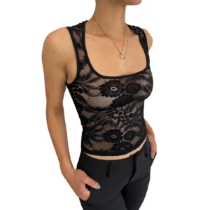 Women’s Summer Tank Tops Sleeveless Scoop Neck See-Through Lace Crop Tops Casual Shirts